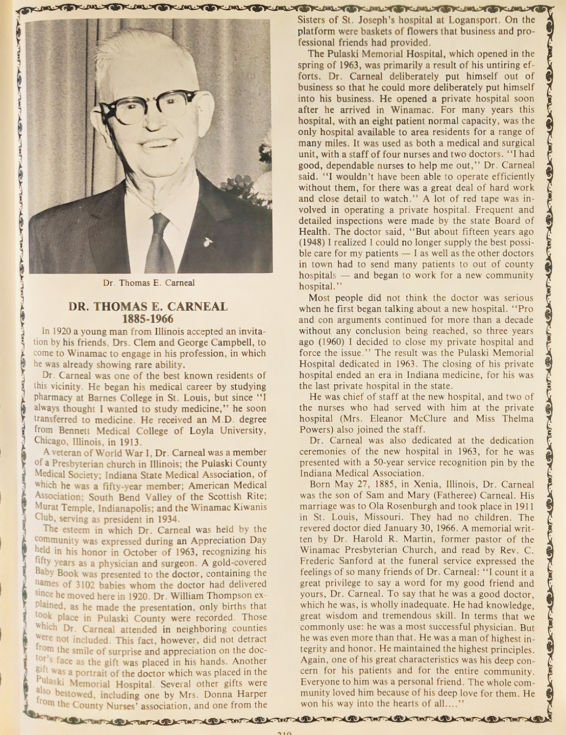 When that practice closed, the building was used by Dr. Michael Rausch DVM, who operated the Winamac Pet Med. [Personal note from the editor: When I moved “home” to Pulaski County, Dr. Rausch took over care of my first cat, Tiger Lily. I took photos of the building with the sign – which, unfortunately, I cannot locate – and showed it to my city friends. “This is the building where I was born; we called it the Carneal Clinic. Now it’s my cat’s doctor’s office….”]