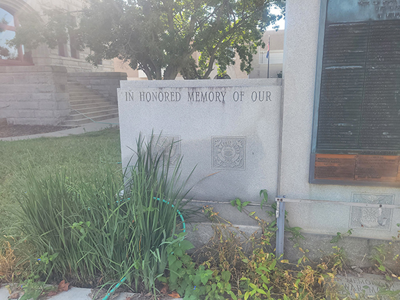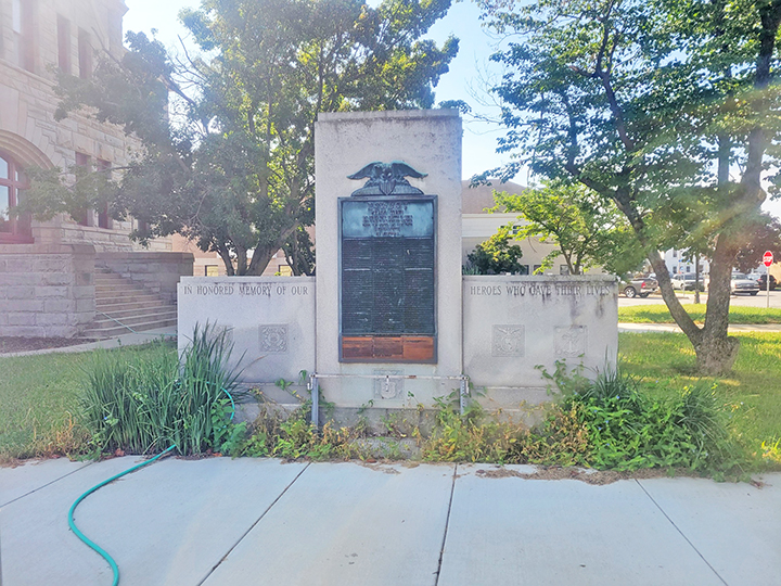 This page will be mainly photos, which will help you place the monuments on the property and will give you the names of those who gave the ultimate sacrifice. NOTE: Photographs were taken at the end of the Courthouse renovation project. The grounds had been fenced off for over a year and were not in the best condition. The first two photos are to help you place them as you walk around to the west side of the Courthouse.
