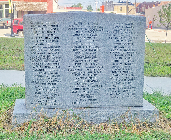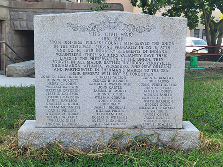 Even though sympathies were divided, Pulaski County sent many young men to fight for the cause of the Union. Mentioned on the memorial are the 87th Indiana and the 46th Indiana. Another unit filled with many Pulaski County soldiers was the 27th Indiana.