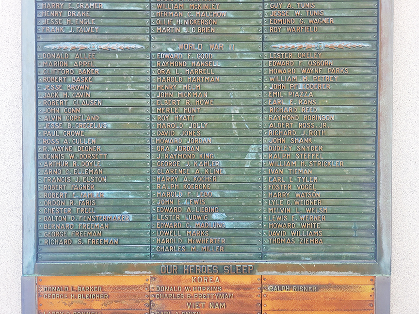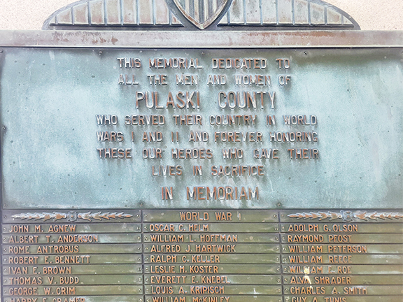 The middle panel lists those from Pulaski County who were killed in action or died as a result of service in WWII.