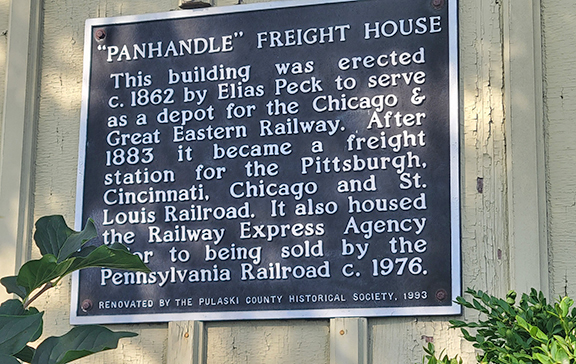 The Panhandle Freight House was erected in 1862 by Elias Peck to serve as a depot for the Chicago & Great Eastern Railway. After 1883, it became a freight station for the Pittsburgh, Cincinnati, Chicago and St. Louis Railroad. It also housed the Railway Express Agency prior to being sold by the Pennsylvania Railroad c 1976.