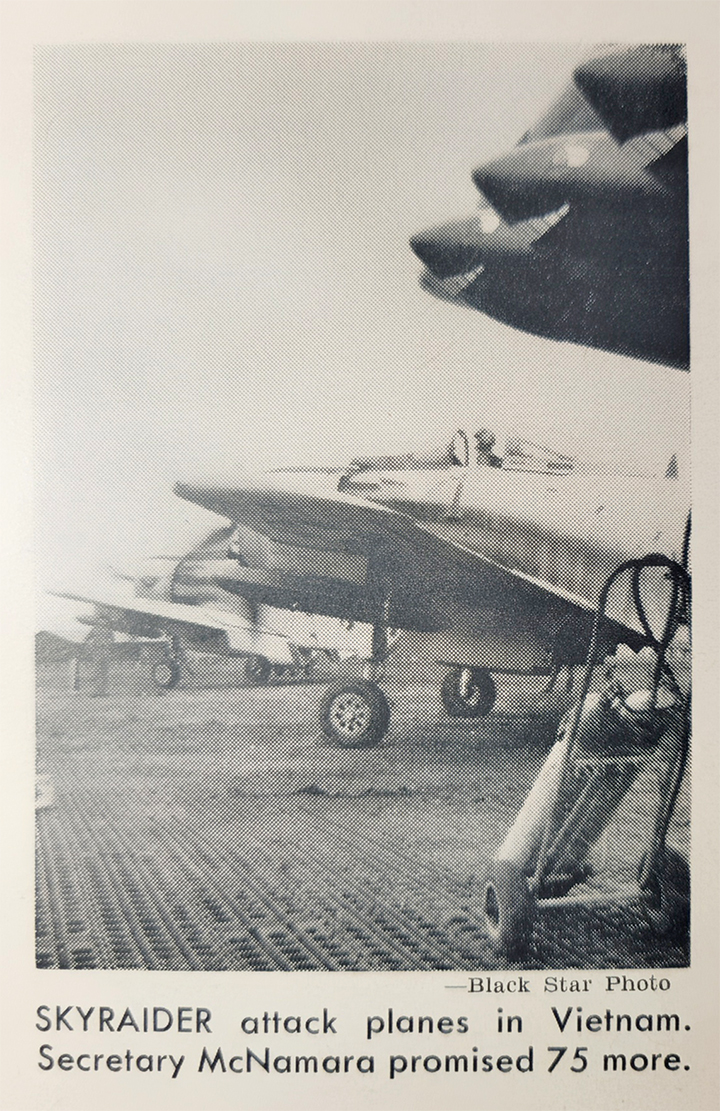 The USAF initiated action in September 1963 to modify A-1E aircraft to replace the T-28 aircraft. The modifications involved extensive engineering and complete overhaul, which have been carried out as quickly as possible. The replacement of T-28s was programmed to occur as the VNAF transitioned from T-28 to A-1H aircraft, the single-seater counterpart of the A-1E. The first A-1E aircraft are enroute now and will arrive in Vietnam early in June. The overall effectiveness of our Air Force’s support of VNAF operations has become very clear: