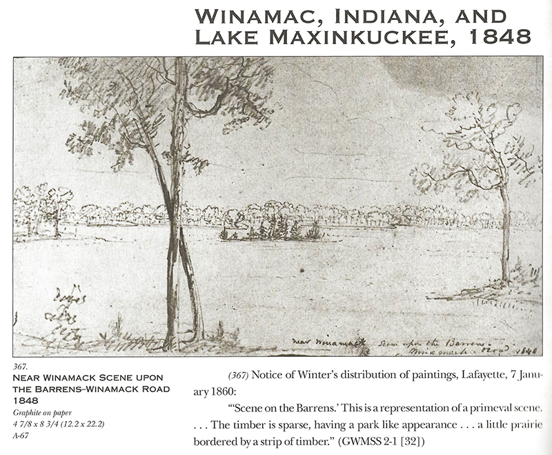 George Winter is famous for his authentic sketches of Native Americans in the 1800s. In the book of his sketches, Indians and a Changing Frontier, the Art of George Winter, plate 367, page 194, is a sketch, “Near Winamack Scene Upon The Barrens-Winamack Road 1848.”
