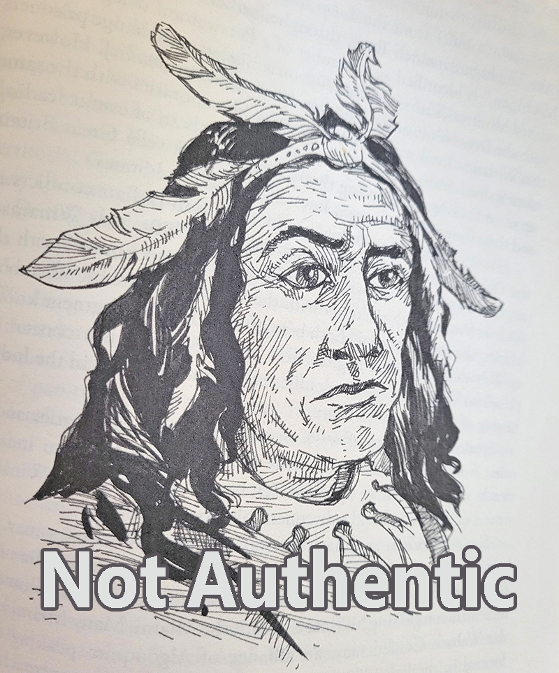 An authentic sketch of Chief Winamac does not exist. SIDE NOTE: One reference, a photocopied page with a handwritten note that stated it was from True Indian Stories by Jacob Piatt Dunn, 1909, stated a sketch of exists in Thatcher’s Indian Biographies. The author of this webpage located both of those books online. The Thatcher book is dated 1833. The books are on order (an original of the Dunn book and a Thatcher book reprinted in 1901). If there is, in fact, a sketch with appropriate citations, it will be shared on this site. Two have been done locally. The sketch used by Alan McPherson and James Carr in their book, Notable American Indians, was developed in Winamac to commemorate National Air Mail Week, May 15-21, 1938. Another, published by Dick Dodd in the Pulaski County Journal, was created for a soup can label. This author does not know: a) why choose a Native American who lived before the Model T for an air mail stamp, and b) what kind of soup would be graced with a picture of Chief Winamac? Both questions will go into the hopper of confusion.