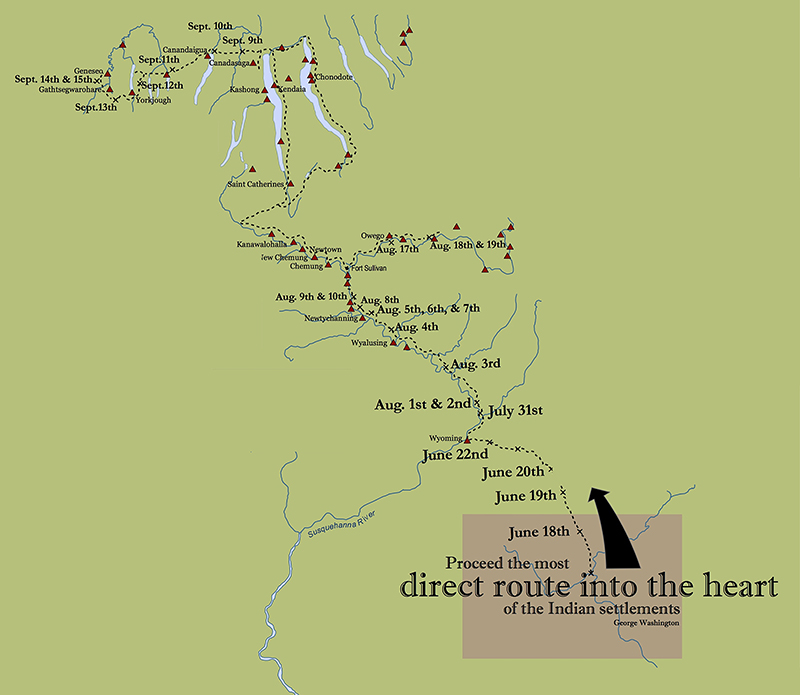 The Expedition you are appointed to command is to be directed against the hostile tribes of the Six Nations of Indians, with their associates and adherents. The immediate objects are the total destruction and devastation of their settlements, and the capture of as many prisoners of every age and sex as possible. It will be essential to ruin their crops now in the ground and prevent their planting more. I would recommend, that some post in the center of the Indian Country, should be occupied with all expedition, with a sufficient quantity of provisions whence parties should be detached to lay waste all the settlements around, with instructions to do it in the most effectual manner, that the country may not be merely overrun, but destroyed. But you will not by any means listen to any overture of peace before the total ruinment of their settlements is effected. Our future security will be in their inability to injure us and in the terror with which the severity of the chastisement they receive will inspire them.