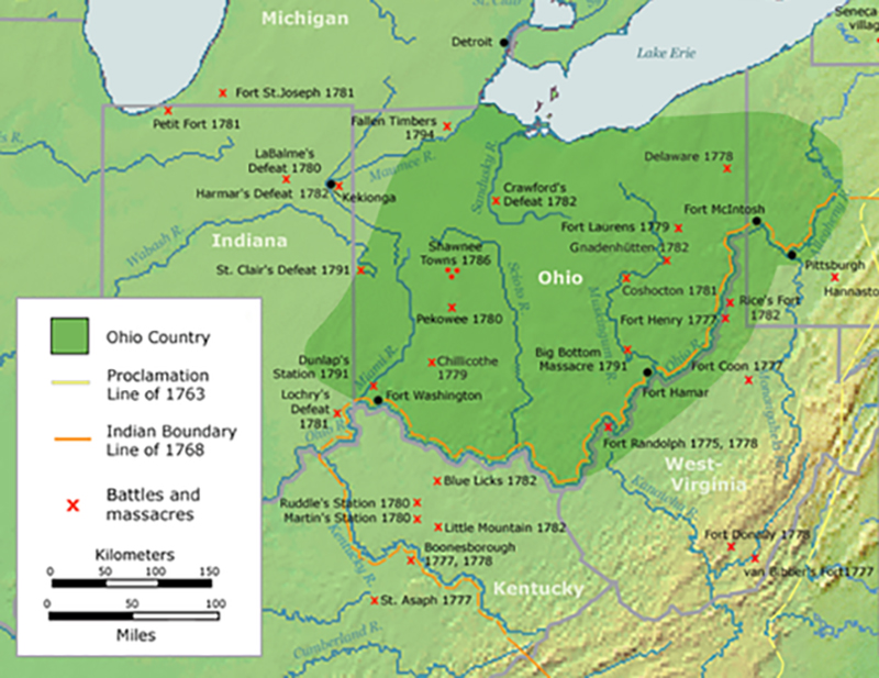 Pressured by colonial expansion in the east, European settlers were not far behind. Shawnee warriors were fighting to keep pioneers like Daniel Boone out of their Kentucky hunting grounds before the Revolution, and they fought in Lord Dunmore’s War against Virginia in 1774. The Revolution turned the Ohio Valley into a fiercely contested war zone. Most Shawnee allied with the British, who had been telling them they could expect nothing less than annihilation at the hands of the Americans. Kentucky militia crossed the Ohio River almost every year to raid Shawnee villages.