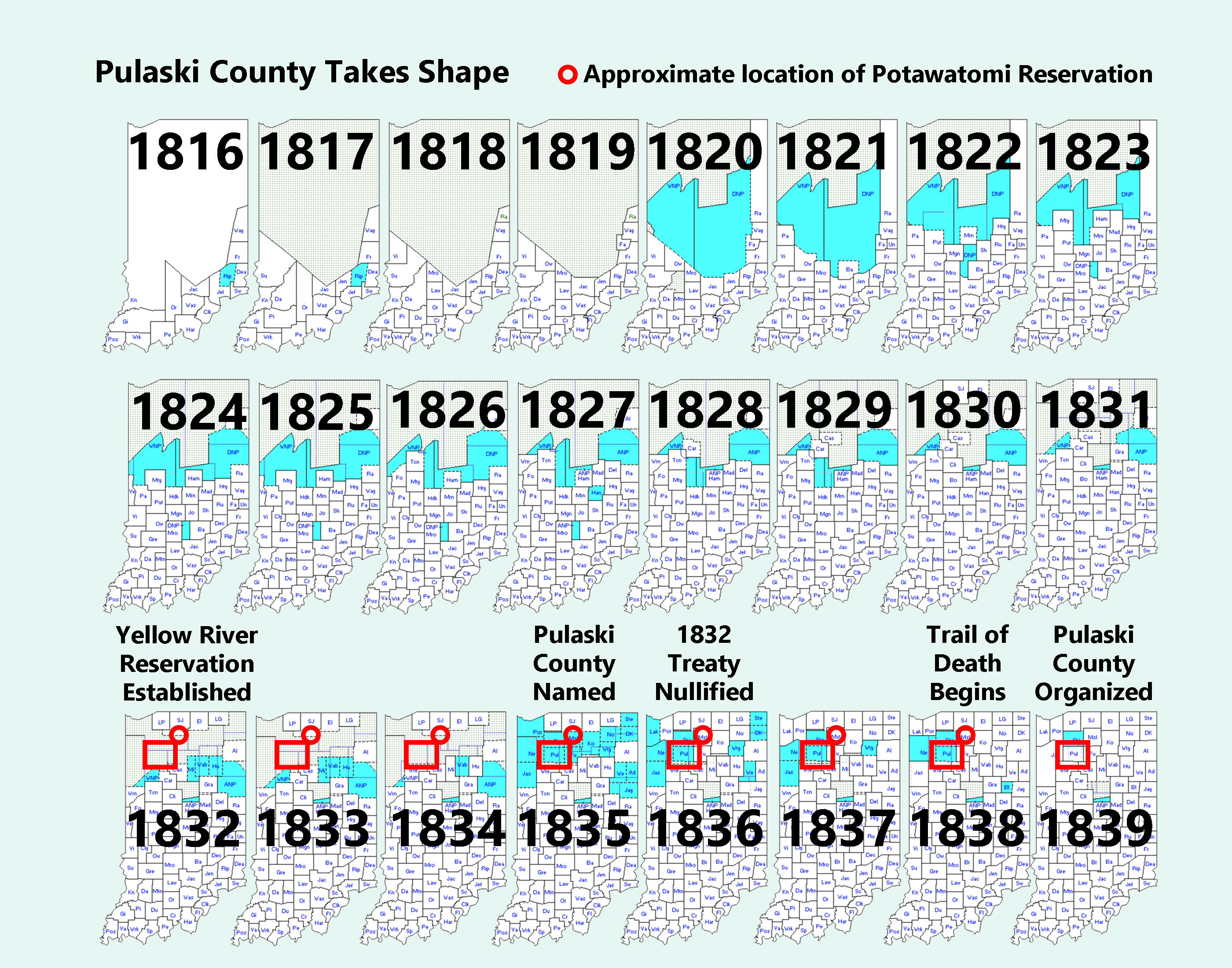 Noble, Porter, Adams, Jay, Kosciusko, Fulton, Marshall organized. |
