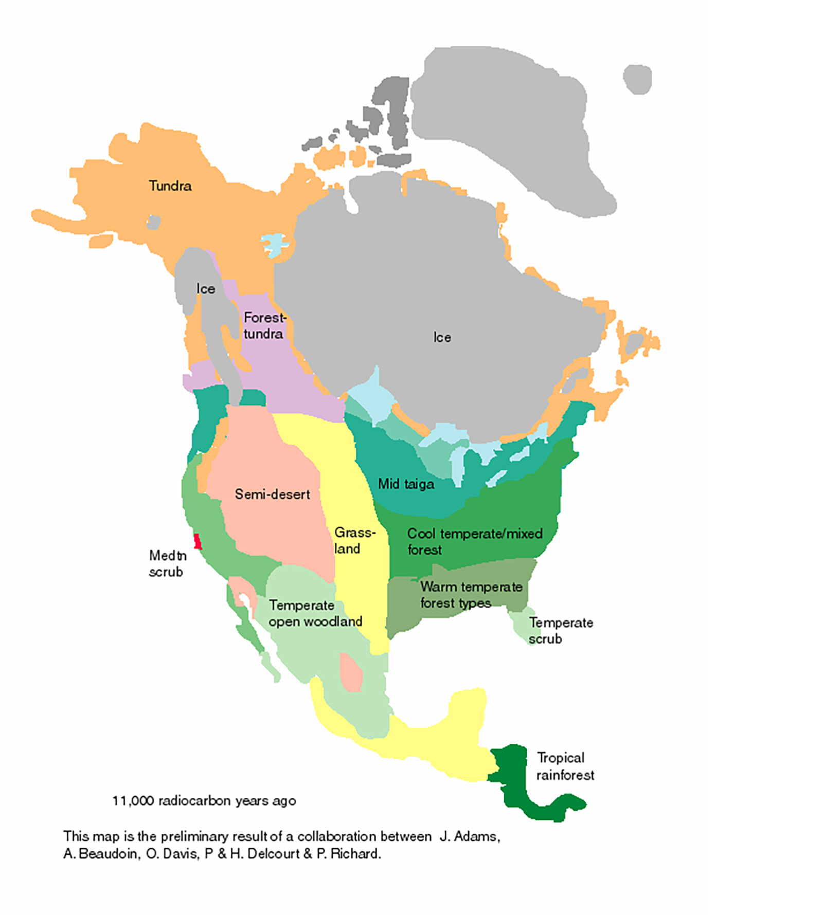 From that time until the present, warming and cooling occurred throughout the continent, changing the patterns of flora and fauna. Eventually, the earth reached what we know today, and, if humans had not continued to grow in population and change the way we live, the earth would still look much like the next map will show, at 500 years ago, when Europeans arrived on our shores.