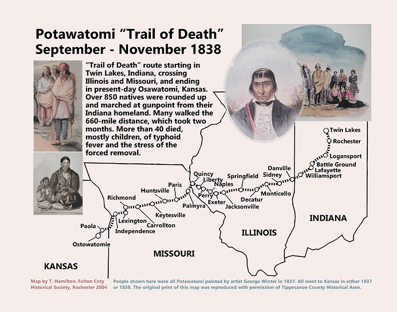 The Potawatomi Trail of Death was the forced removal by militia in 1838 of some 859 members of the Potawatomi nation from Indiana to reservation lands in what is now eastern Kansas. The march began at Twin Lakes, Indiana (Myers Lake and Cook Lake, near Plymouth, Indiana) on November 4, 1838, ending near present-day Osawatomie, Kansas. During the journey of approximately 660 miles over 61 days, more than 40 persons died, most of them children. It marked the single largest Indian removal in Indiana history. Although the Potawatomi had ceded their lands in Indiana to the federal government under a series of treaties made between 1818 and 1837, Chief Menominee and his Yellow River band at Twin Lakes refused to leave, even after the August 5, 1838, treaty deadline for departure had passed. Indiana Governor David Wallace authorized General John Tipton [who founded the town of Logansport, Indiana] to mobilize a local militia of one hundred volunteers to forcibly remove the Potawatomi from the state. On August 30, 1838, Tipton and his men surprised the Potawatomi at Twin Lakes, where they surrounded the village and gathered the remaining Potawatomi together for their removal to Kansas. Father Benjamin Marie Petit, a Catholic missionary at Twin Lakes, joined his parishioners on their difficult journey from Indiana, across Illinois and Missouri, into Kansas. There the Potawatomi were placed under the supervision of the local Indian agent (Jesuit) father Christian Hoecken at Saint Mary’s Sugar Creek Mission, the true end point of the march. Historian Jacob Platt Dunn is credited for naming the Potawatomi’s forced march “The Trail of Death” in his book, True Indian Stories (1909). The Trail of Death was declared a Regional Historic Trail in 1994 by the state legislatures of Indiana, Illinois, and Kansas; Missouri passed similar legislation in 1996. As of 2013, there were 80 Trail of Death markers along the route: they were located at the campsites set up every 15 to 20 miles (a day’s journey by walking), in all four states. Historic highway signs have been placed along the way in Indiana in Marshall, Fulton, Cass, Carroll, Tippecanoe and Warren counties, signaling each turn. Many signs have been erected in Illinois and Missouri. Kansas has completed placing highway signs in the three counties crossed by the Trail of Death.