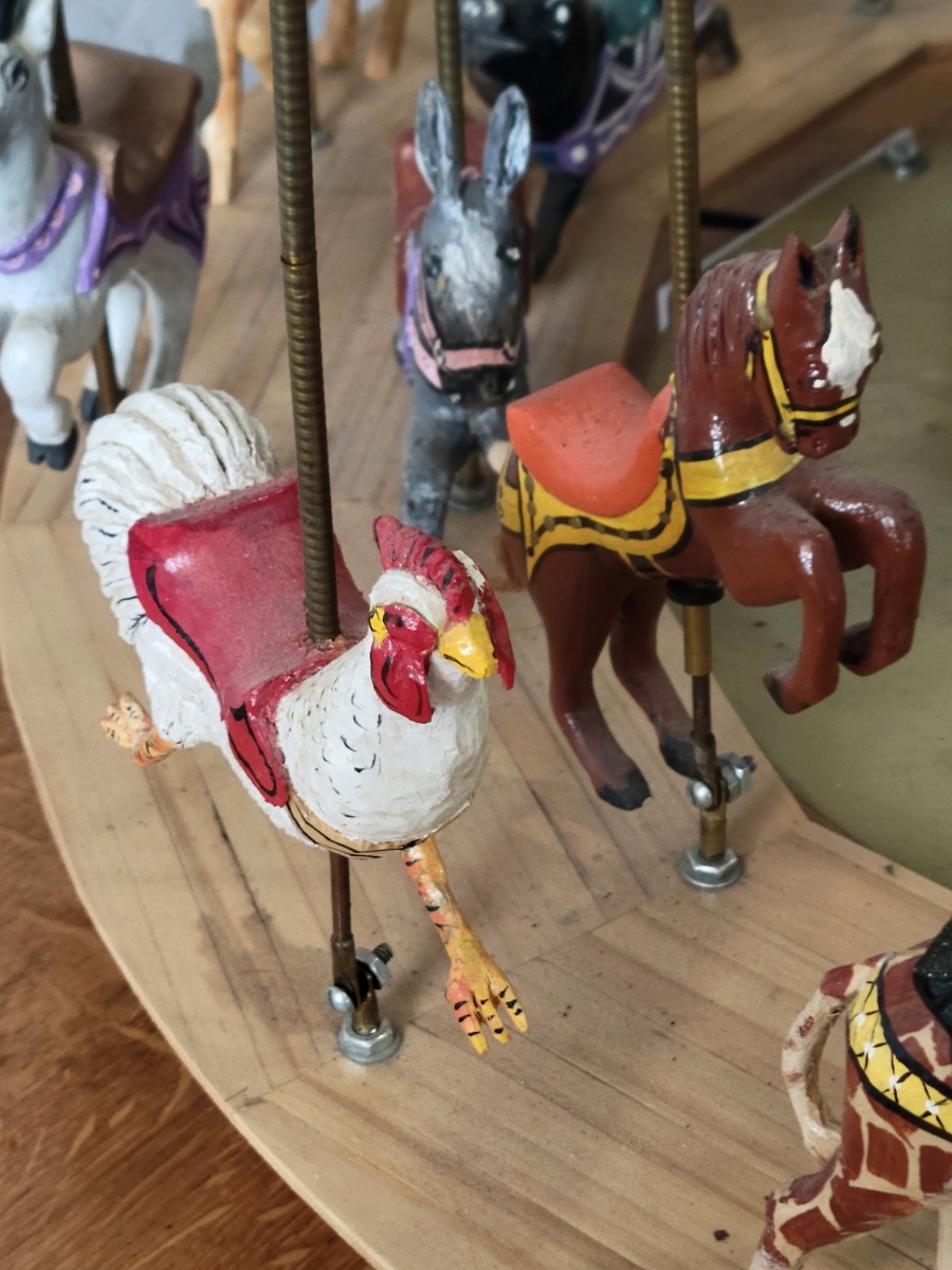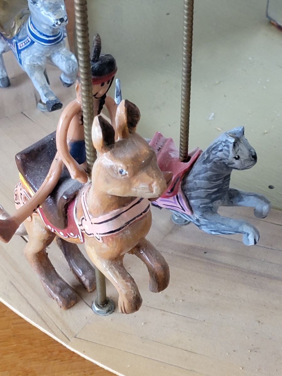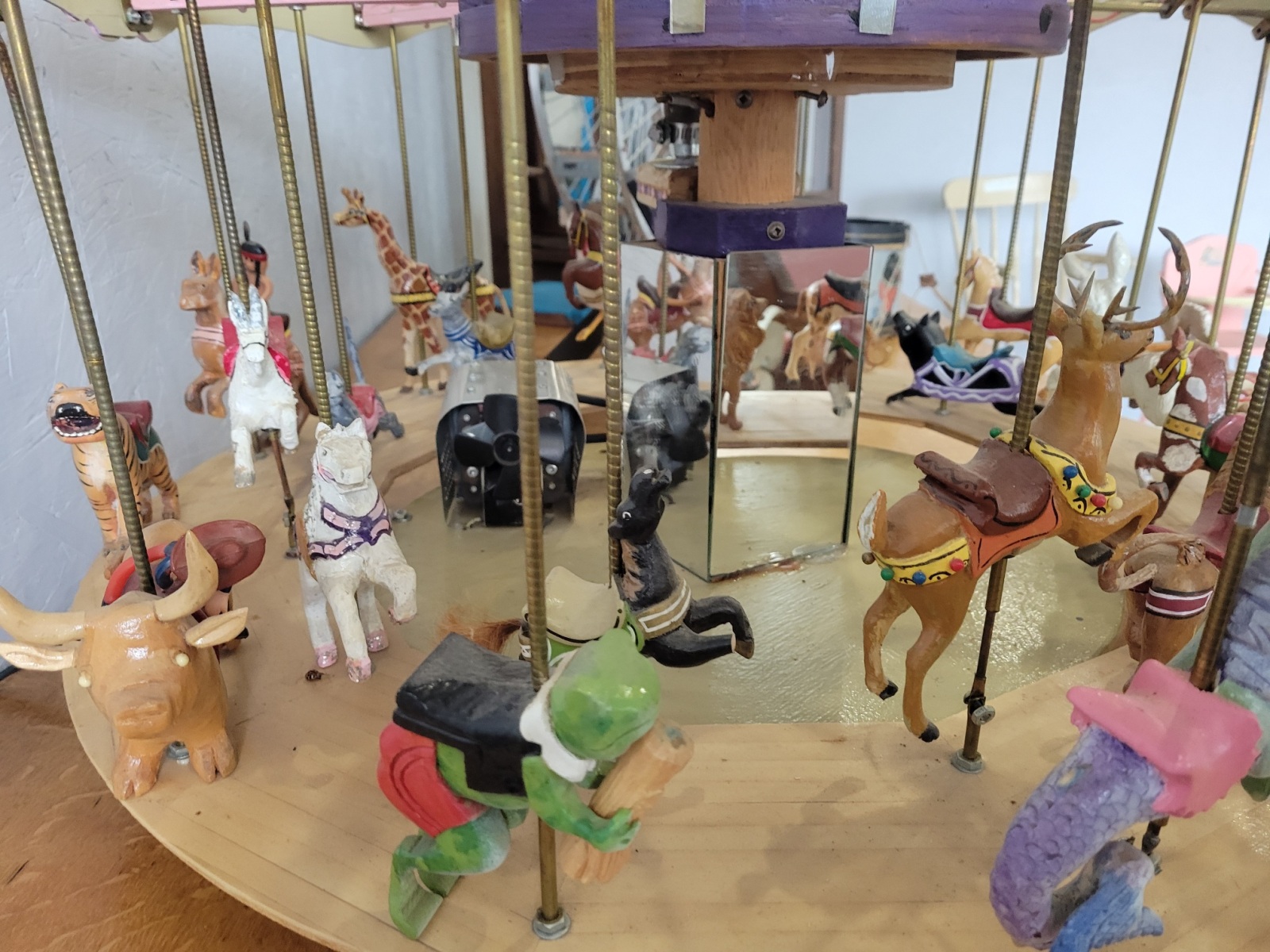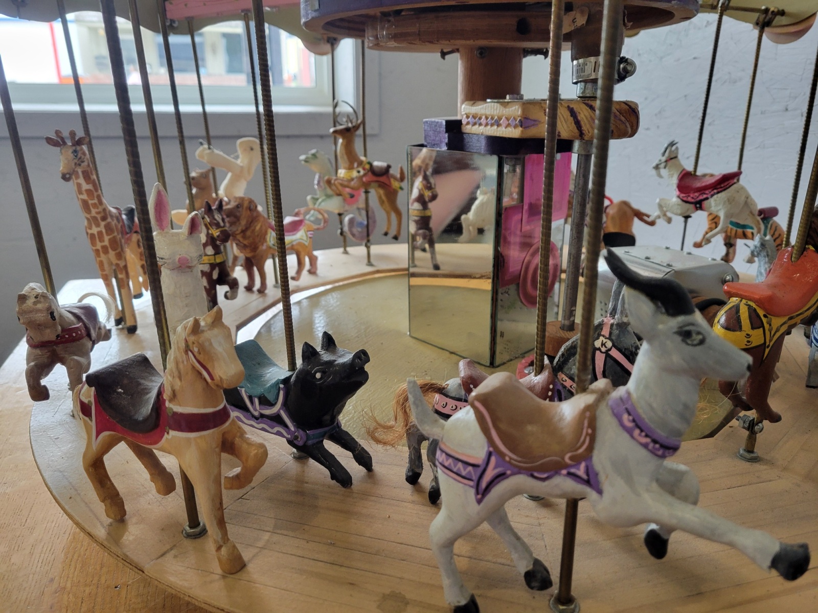 One of Don’s most well-known pieces of work is a replica of the Dentzel Carousel from Riverside Park in Logansport. Our museum is honored to have an earlier work, a replicat of Dentzel’s original carousel, or at least, a carousel that features some of Dentzel’s earliest work.