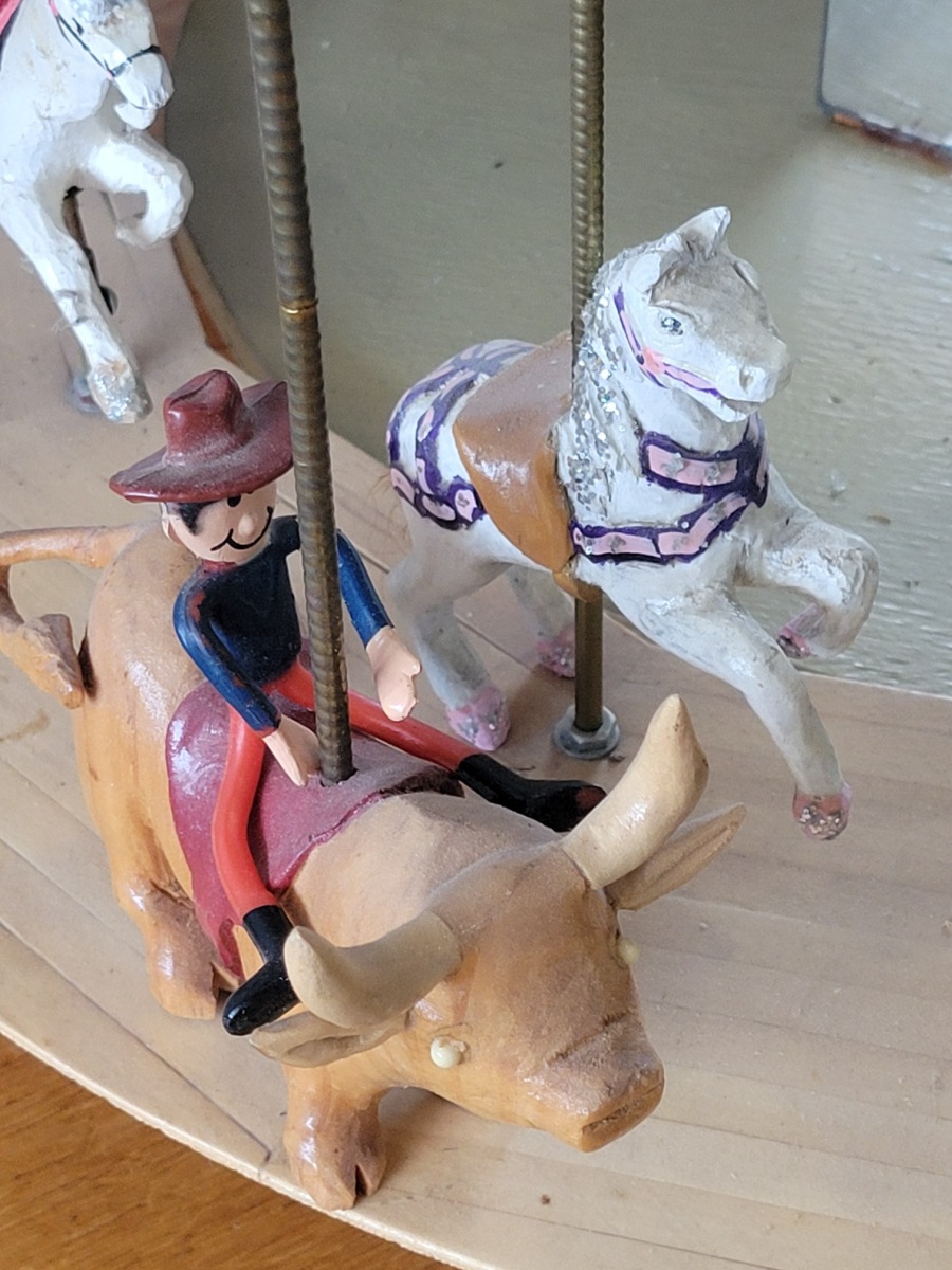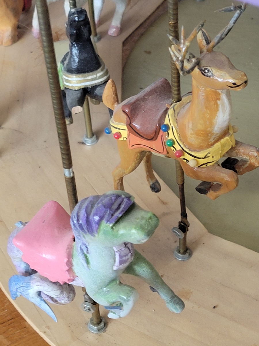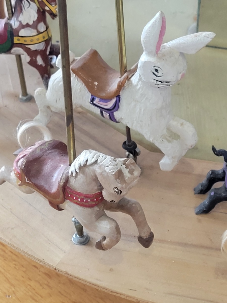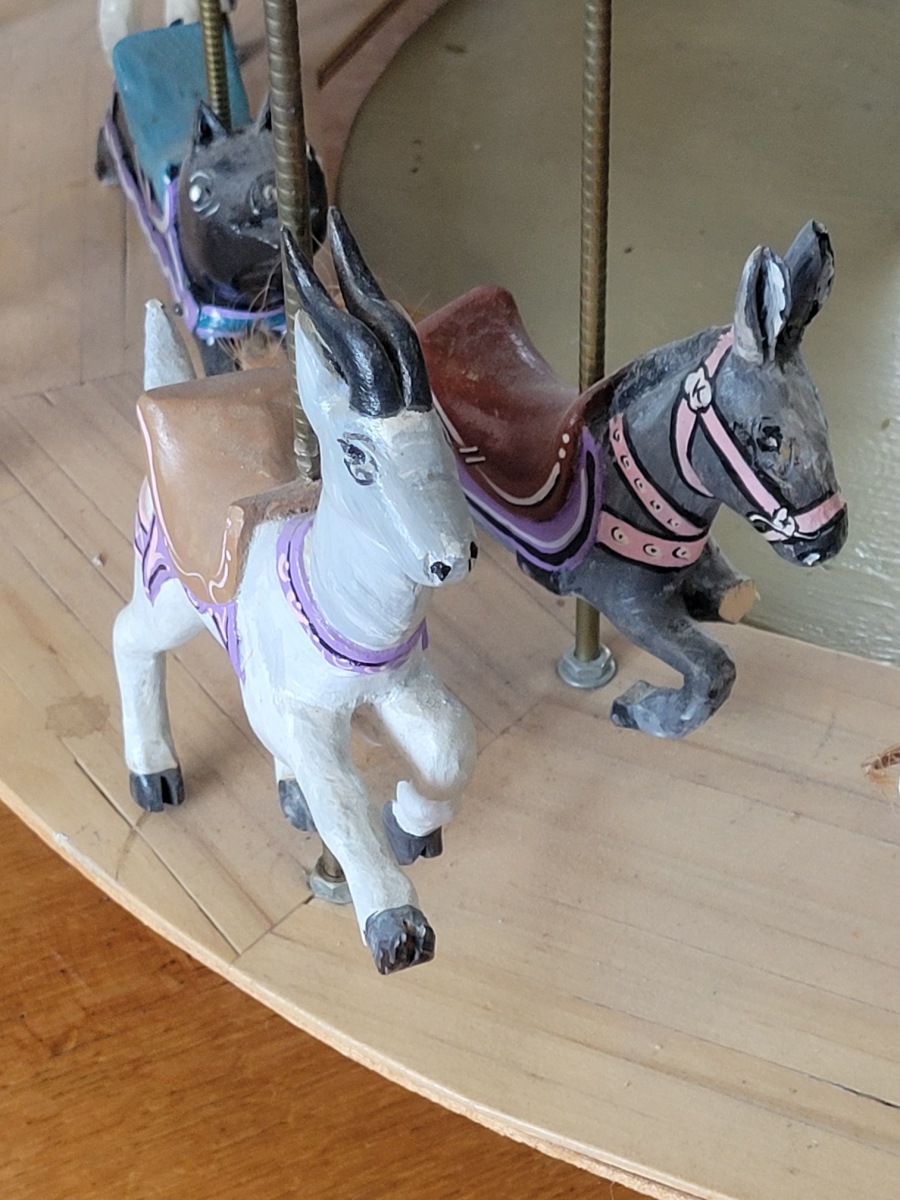 One of Don’s most well-known pieces of work is a replica of the Dentzel Carousel from Riverside Park in Logansport. Our museum is honored to have an earlier work, a replicat of Dentzel’s original carousel, or at least, a carousel that features some of Dentzel’s earliest work.