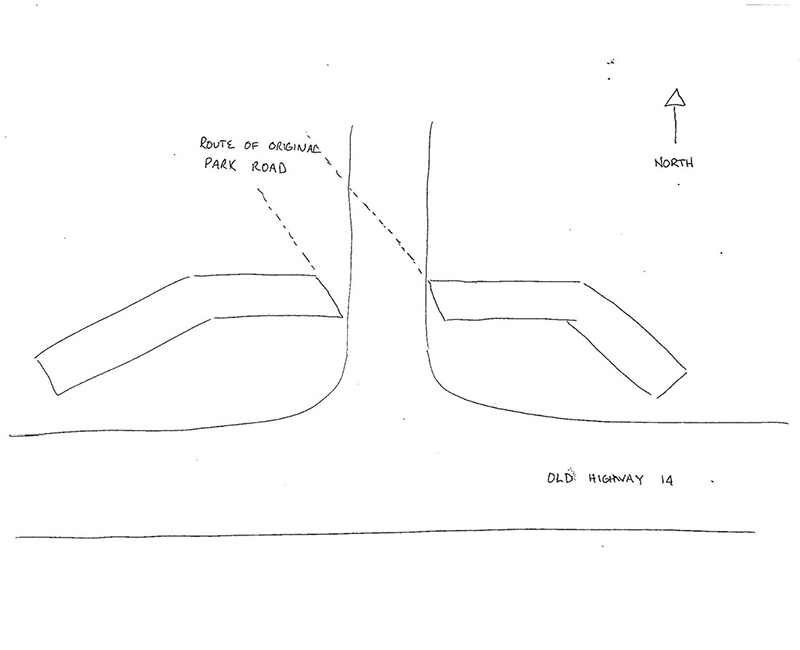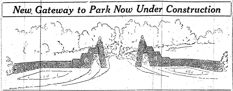 Back to the gateway and noted in an article written by Fred Zahrt in 1998, if you stand inside the park and look south at the towers of the gateway, you will notice they are slanted. If you move west, they become parallel, marking the direction of the original road into the park. A drawing that he made to illustrate the slant appears here. It would be interesting to know how that worked. The CWA built the driveway that goes straight and then around the park, but apparently the “main” road still turned slightly to the left at the entrance.