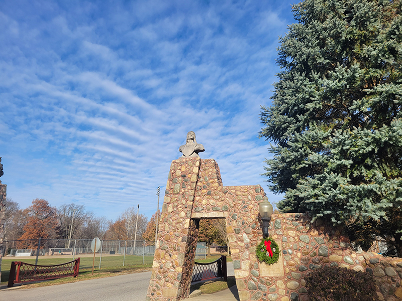 At some point, work resumed. Park funds were used, and the town was able to tap into township relief funds. Mr. Rearick, according to the Pulaski County Democrat, donated his time and talents in designing the gateway and sculpting the statues.