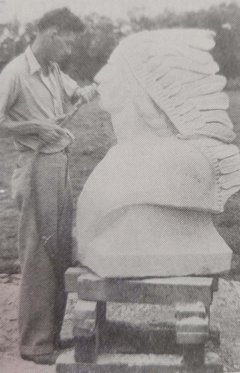 The article announcing the gateway described the use of large round rocks in its construction and “huge figures” to be carved from Indiana limestone. A local man, Russell Rearick, designed the gate and was to assist in the construction. He was to bethe creator of the sculptures to adorn each side of the gate. The article described Rearick as a sculptor “of recognized ability, with a number of art prizes to his credit.”