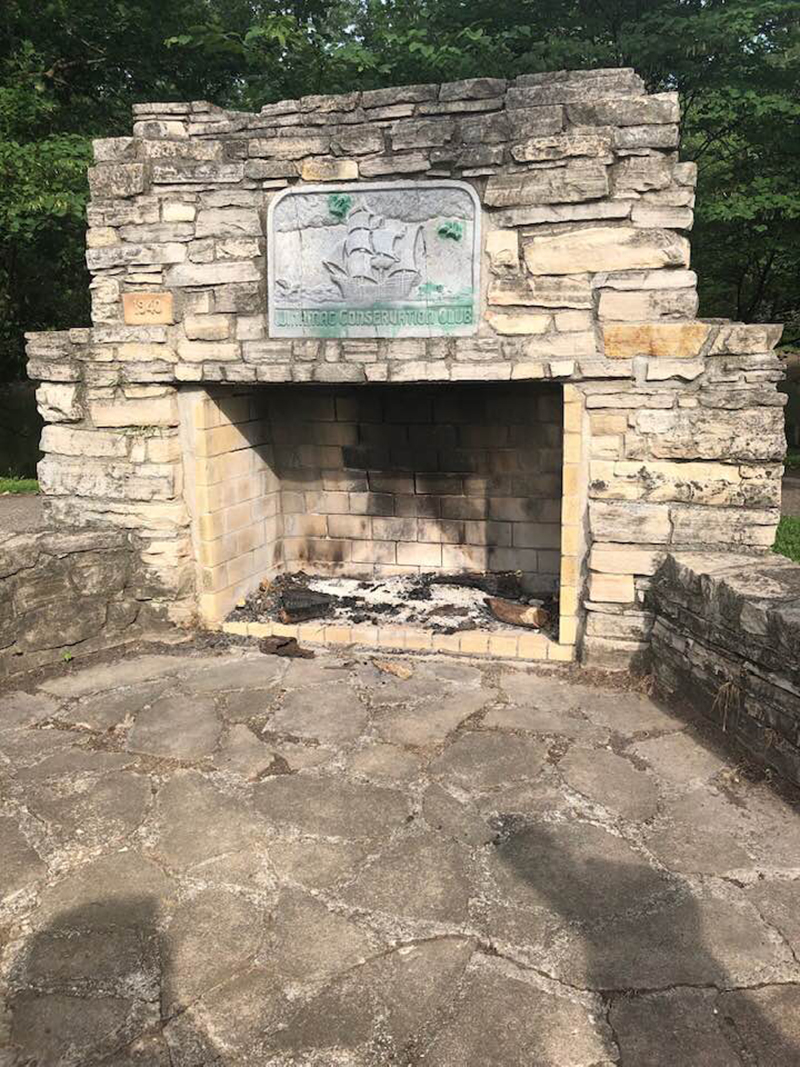 A large open fireplace, located between the pond and the river’s edge, was completed during the first week of December 1940. Twelve tons of limestone were used in the building of the fireplace. Embodied in the mantle is a 600-pound granite plaque, a gift of J. Lon McKinley.