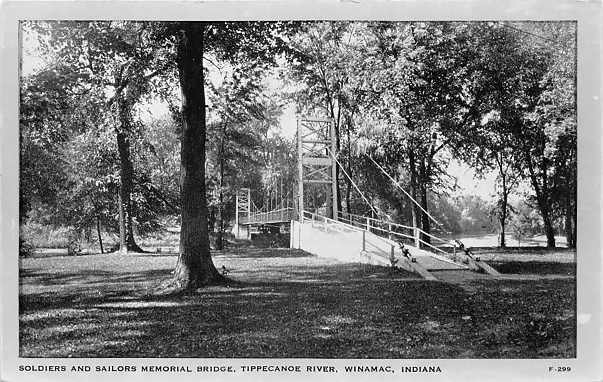 According to two databases, national and international, Memorial is the only suspension-type bridge traversing the Tippecanoe River. It is one of twenty-one suspension bridges constructed in the State of Indiana and one of twelve still standing and in use. It appears to be the third oldest bridge that is still standing. (Some bridges in the databases are not dated.) Originally planned for community development and recreation, by the time the contract was let to Mr. Nutt on April 6, 1923, local leaders had decided to dedicate the bridge to Pulaski County soldiers of all wars, thus the name, Memorial.