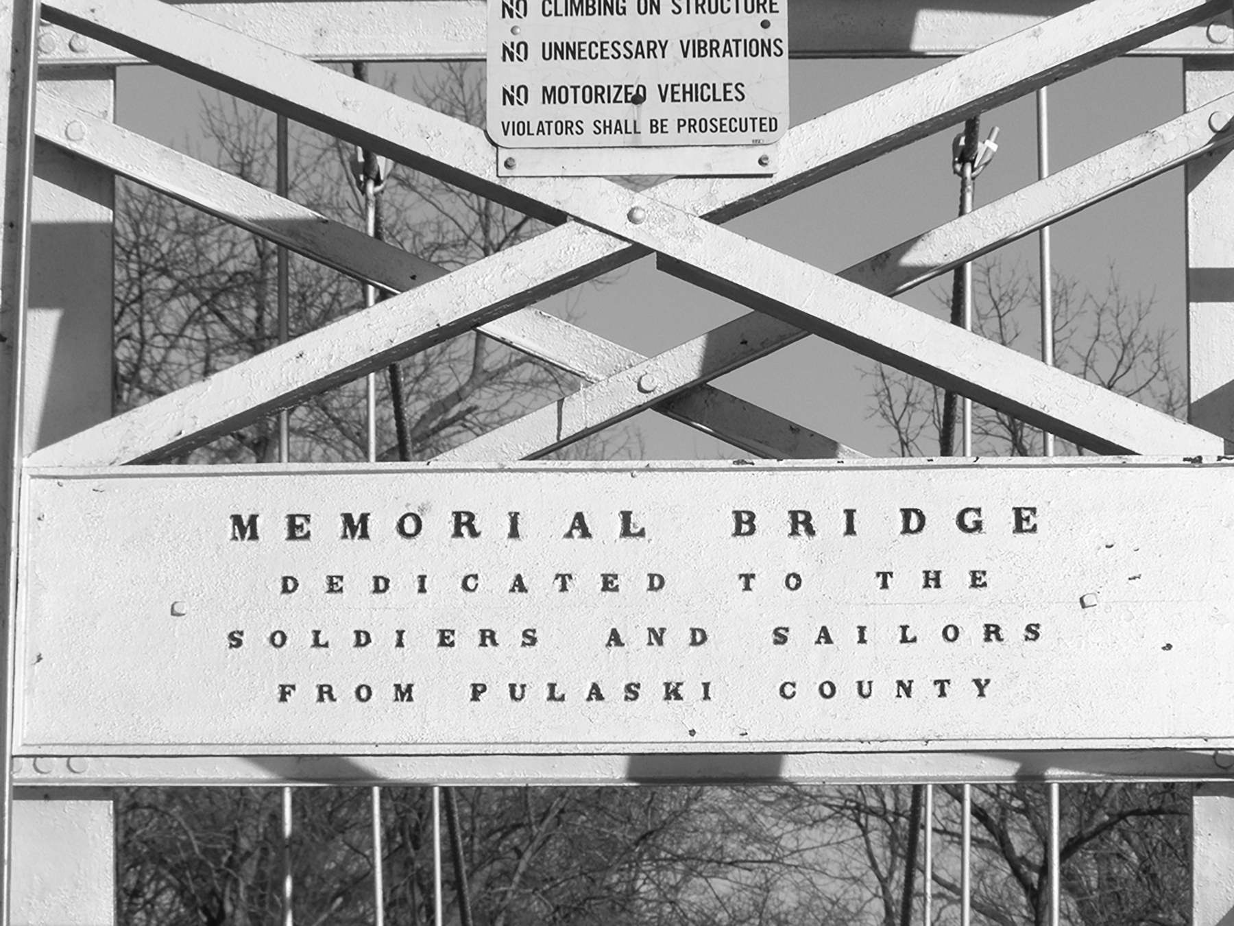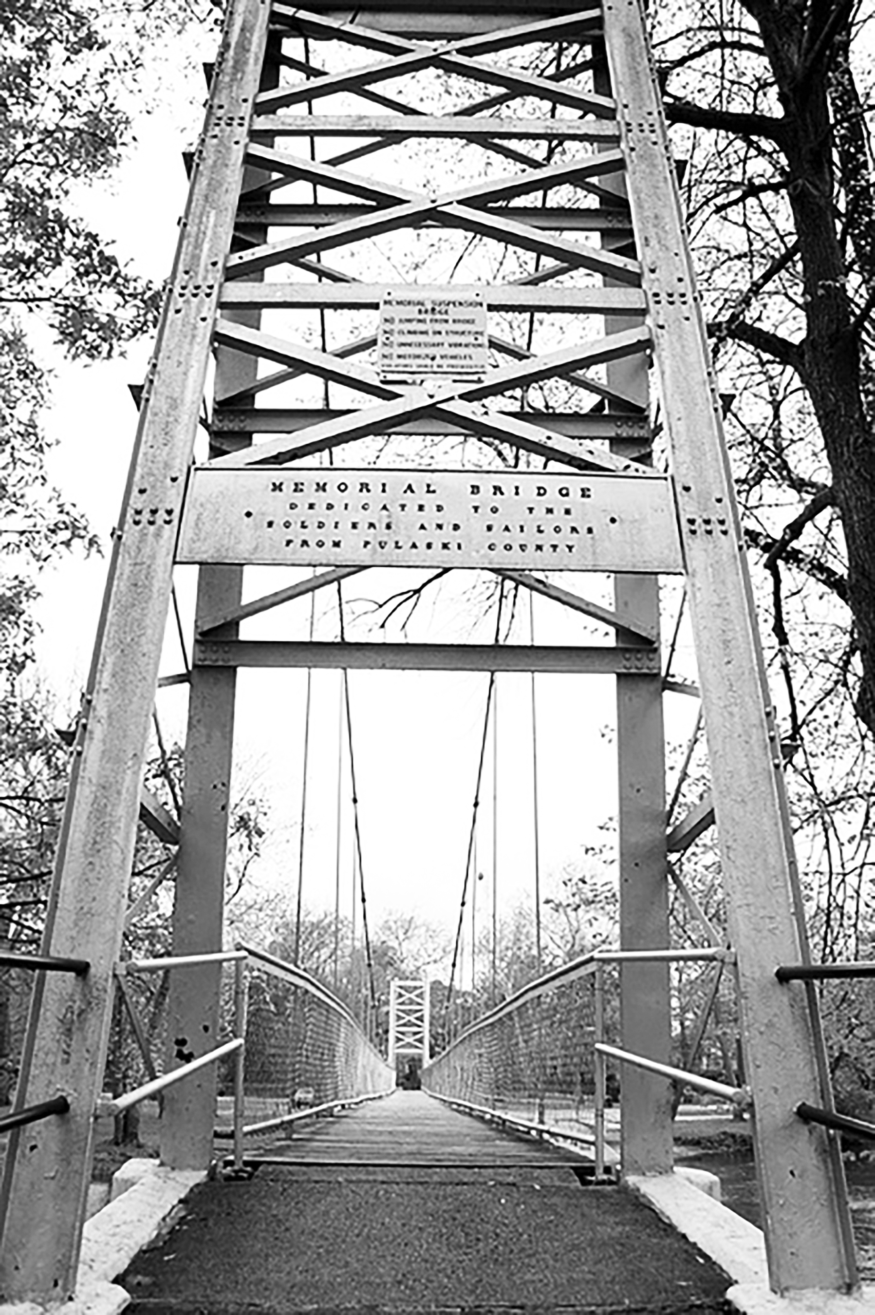 Originally, the bridge was conceived as a point of pedestrian travel from one park to the other. The purpose was to secure for the town a first-class tourist destination. As plans progressed, the bridge was also to become a memorial to Pulaski county soldiers of all wars, thus the name, Memorial. With that decision, the Town, the Park Association and the Kiwanis Club determined that bridge construction should be complete by June 1.