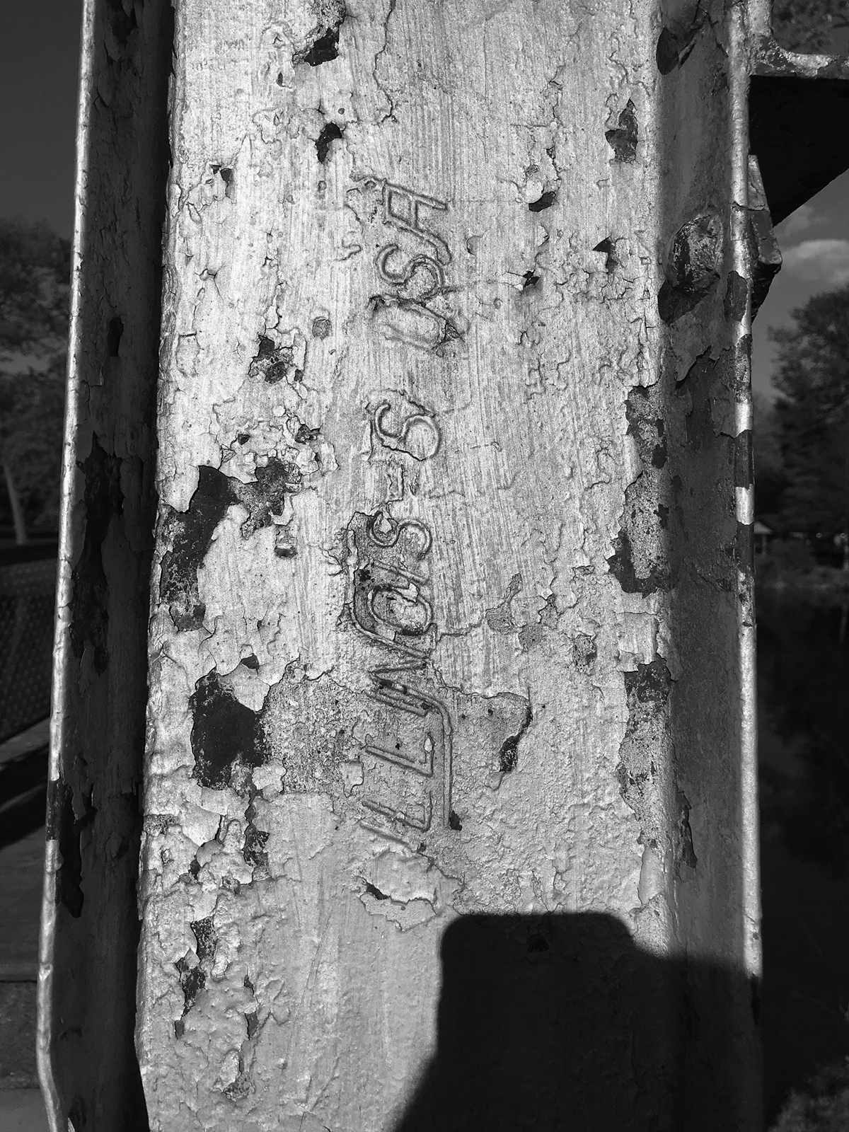 Working on a theory that the bridge was a “kit bridge,” much like a Sears home, an inspection was made of the bridge towers. Markings on the eight legs of the towers indicate they were constructed by the Chicago South Works, a subsidiary of Illinois Steel. The markings are consistent with steel markings in the 1910-20 timeframe. The South Works was located at the mouth of the Calumet River, just over the Indiana State line. The company would have been well known to a bridge engineer from Winamac.