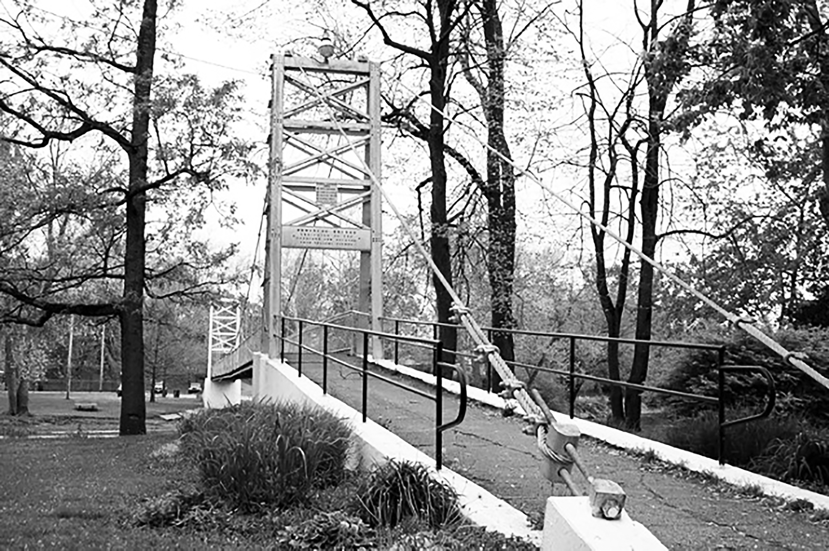 The Tippecanoe River floods every year. Some years, flooding is severe, particularly at the area of the horseshoe bend surrounding the park. R. E. Nutt, the engineer and eventual contractor for Memorial, developed specifications to place the bridge well above danger from high water. He designed a single span suspension bridge, 200 feet long and five feet wide, with steel towers embedded in concrete. Steel suspension cables stretch from tower to tower, and suspender cables hold the deck in place.