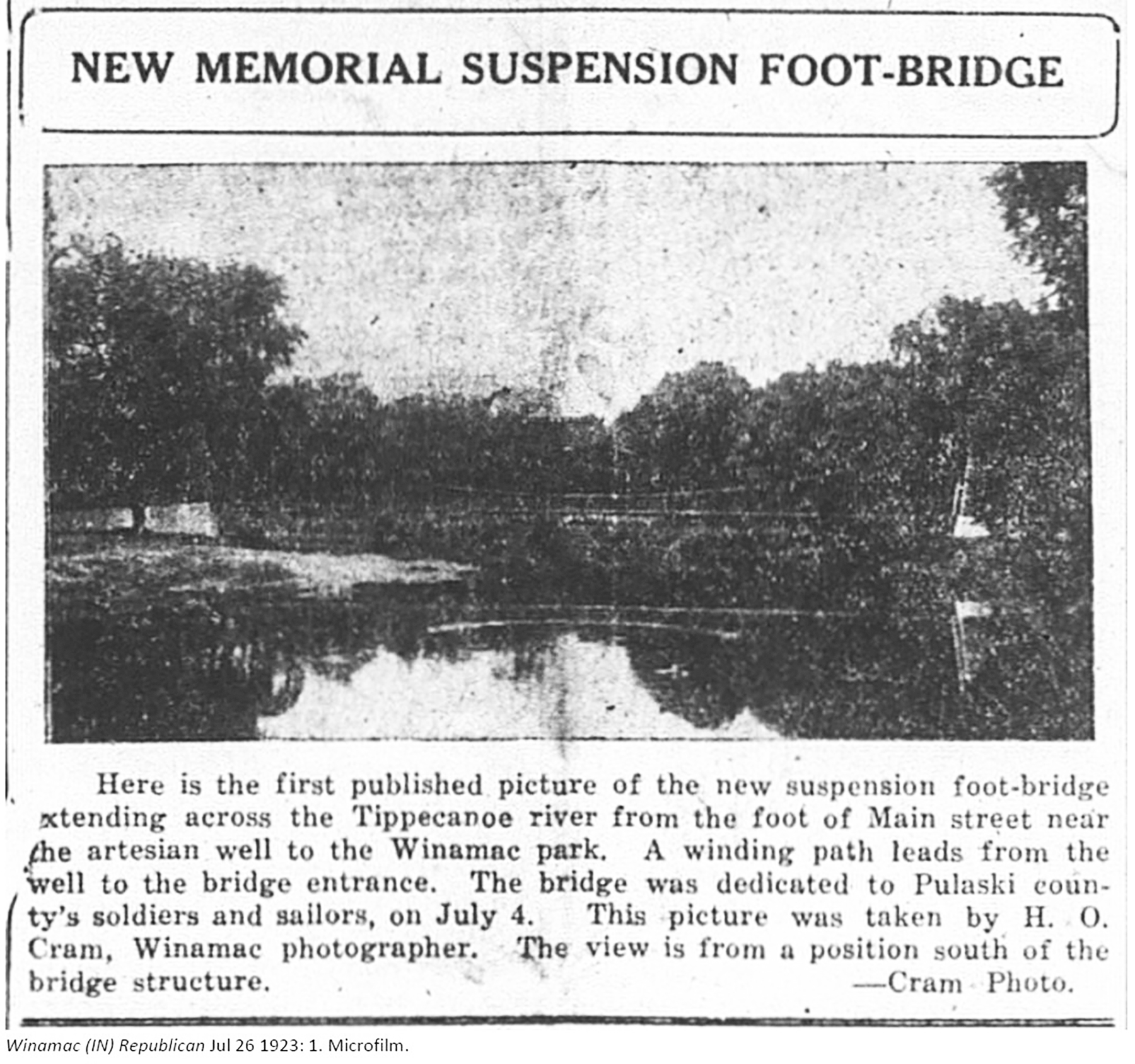 Winamac Republican Mar 1, 1923, Microfilm: New Foot-Bridge To Span River: Proposal Advanced by Park Association to Secure Steel Suspension Bridge to River Park – A meeting of the stockholders of the Winamac Park Association will be held at the offices of Reidelbach Bros., tonight, to discuss, among other things, possible plans for the construction of a permanent suspension foot-bridge over the Tippecanoe river to connect the artesian well park with the river park.