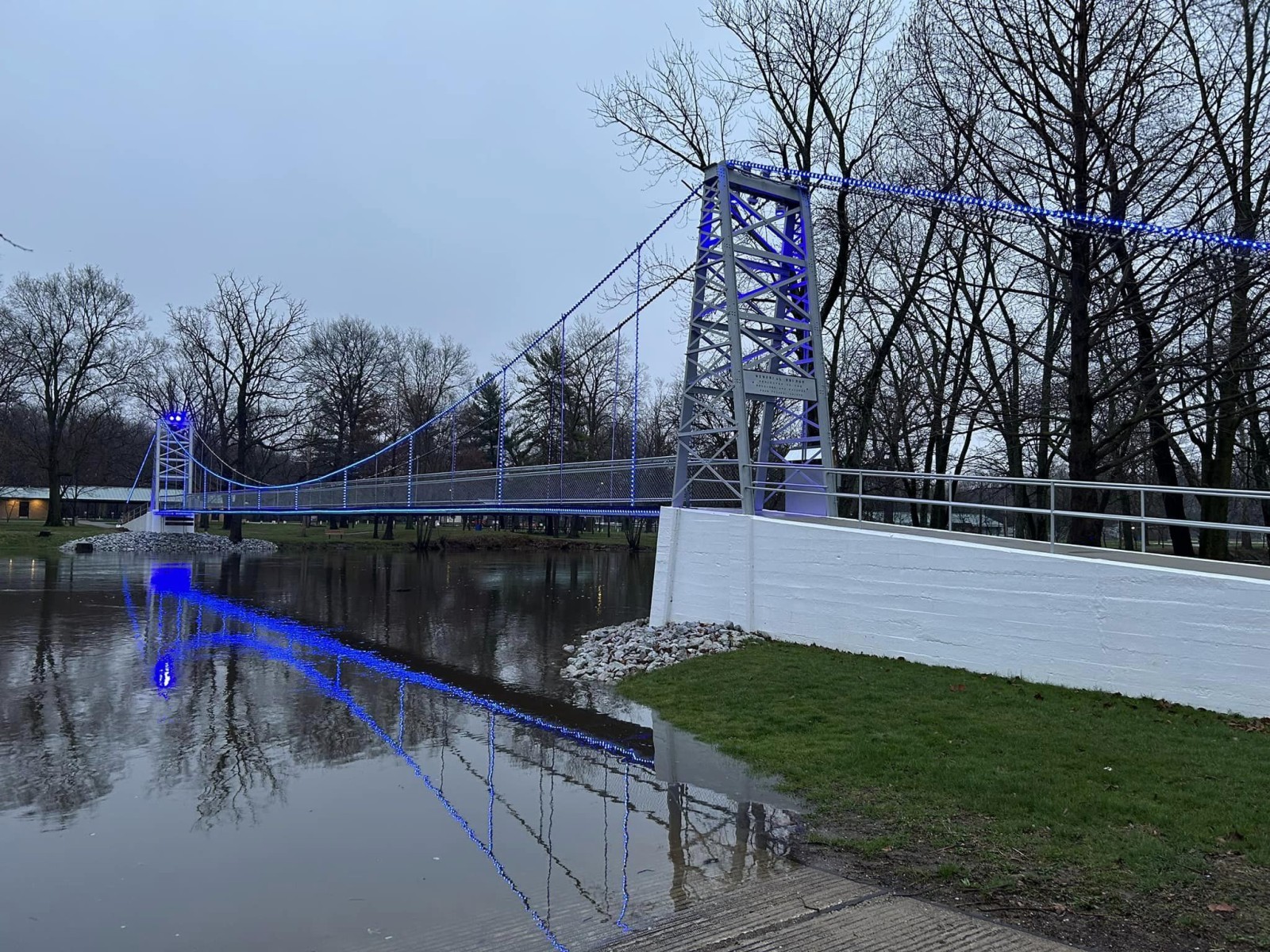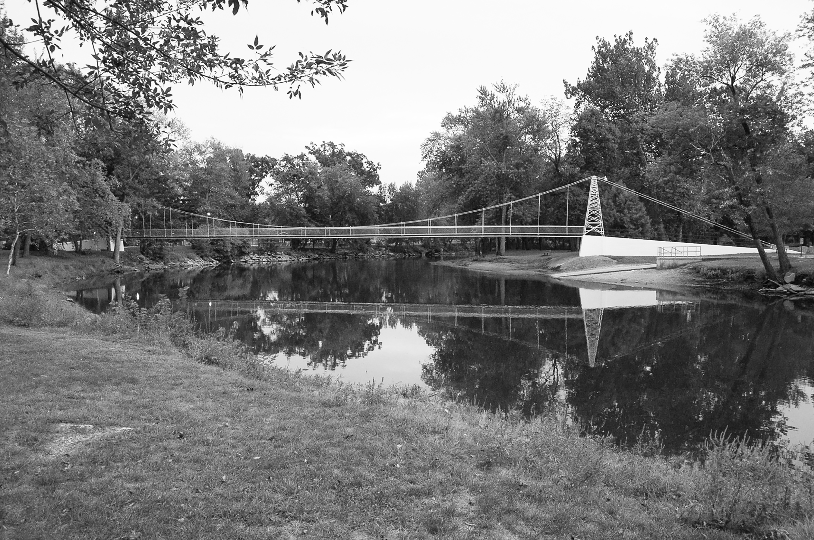 The Tippecanoe River floods every year. Some years, flooding is severe, particularly at the area of the horseshoe bend surrounding the park. R. E. Nutt, the engineer and eventual contractor for Memorial, developed specifications to place the bridge well above danger from high water. He designed a single span suspension bridge, 200 feet long and five feet wide, with steel towers embedded in concrete. Steel suspension cables stretch from tower to tower, and suspender cables hold the deck in place.