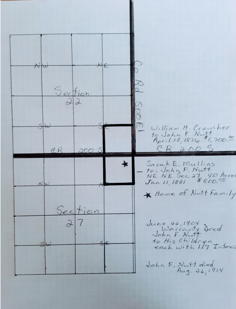 The Nutt property straddled County Road 200 South. John F. Nutt purchased the parcel on the northwest corner from William H. Croucher in 1876. The southwest corner was purchased from Sarah E. Mullins in 1881. In 1904, he deeded the land to his children, each having a 1/7 interest. John F. Nutt passed away in 1914. We have done no further property searches, but we know that the Williams family purchased the property in 1945. This photo was provided by Deb DeSchepper. It is what remained of the Nutt homestead as her father, Carl Williams, pulled it down in the late 1970s.