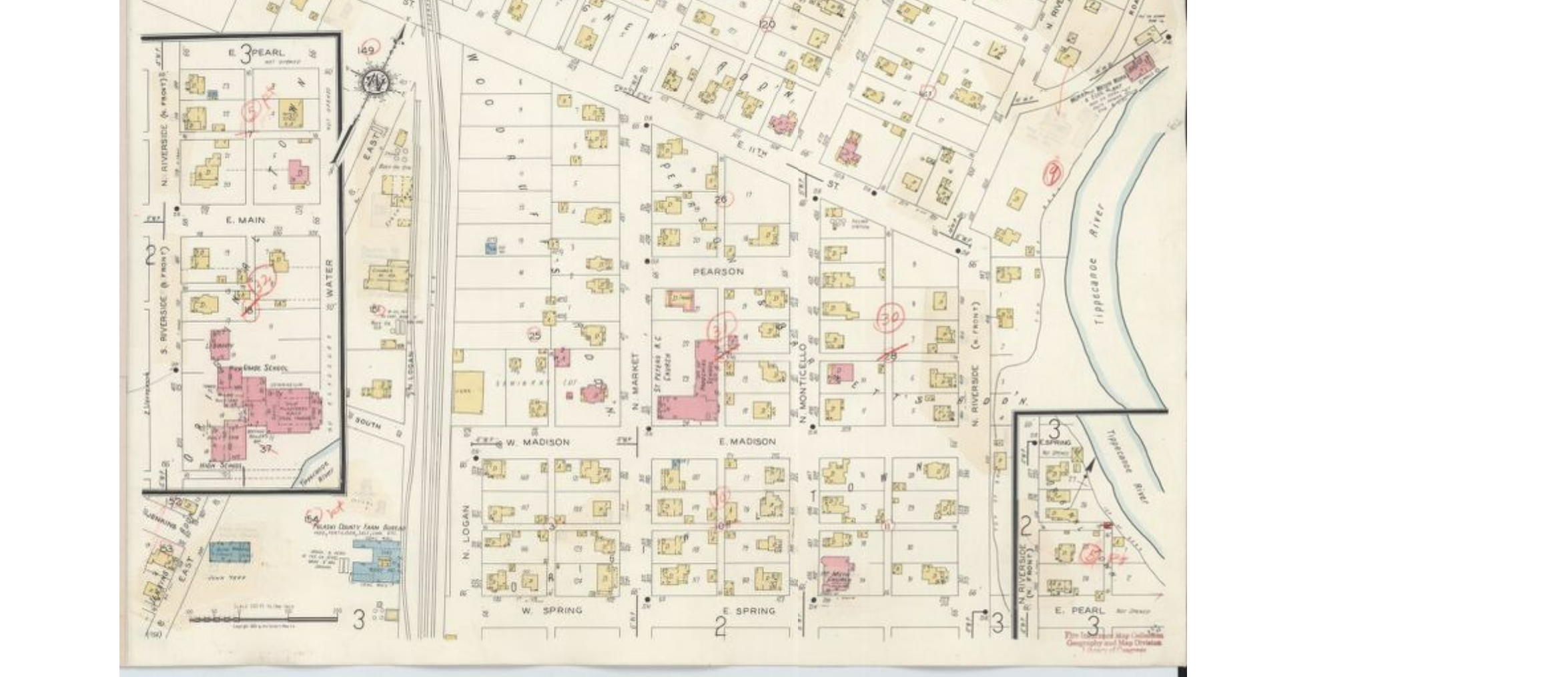 The Town of Winamac was founded in 1839. As originally laid out, twenty blocks of eight lots each, and two fractional blocks, the streets went, north to south, Madison, Spring, Pearl, Main, Jefferson, Adams and Washington. “Next to the river on the east” Water Street (the roadway was never built), then west in order, Front (now Riverside), Monticello, Market and Logan. The town was platted to include the area next to the river where the Artesian Well was later drilled by the Winamac Gas and Oil Company.