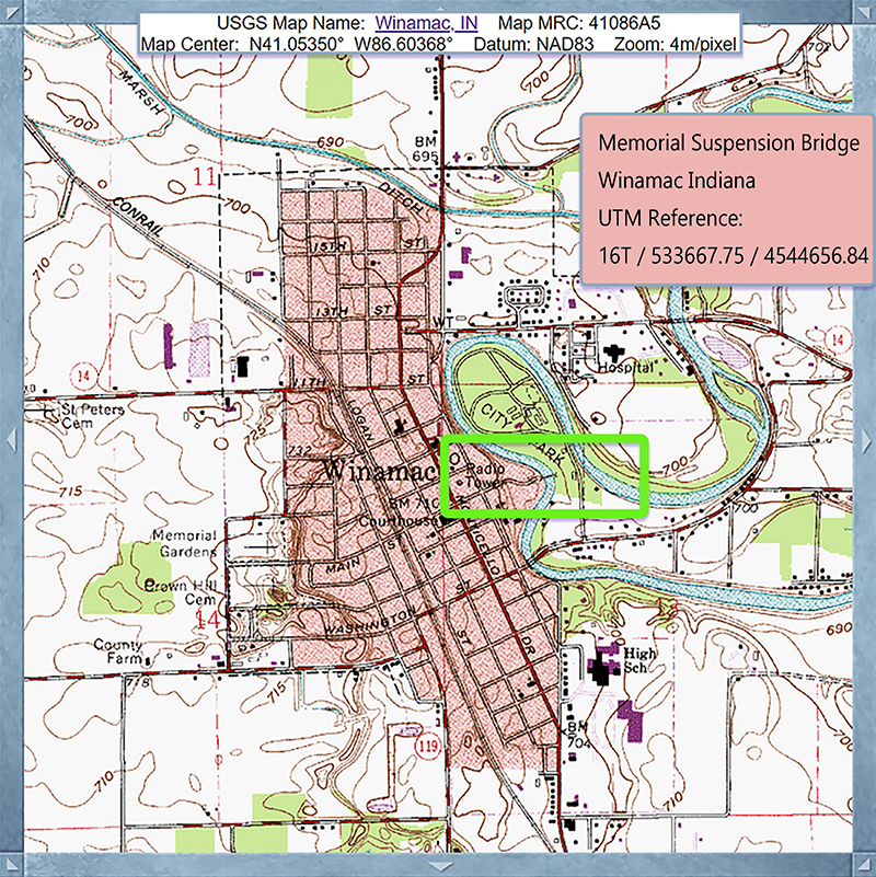 Memorial, a suspension footbridge, spans the Tippecanoe River, linking two parks from the Winamac Town Park system: the Artesian Well Park and the Winamac Town Park. Memorial is the only bridge from the Bridgemeister suspension bridge inventory to cross the Tippecanoe River.