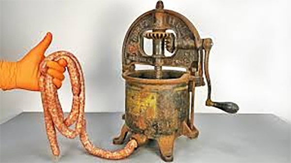The assemblages in question were always at night, which at that season are at their longest, while farm work was then slack so that no one was in any hurry to go home. Perhaps the attendance was more limited to intimate friends or relatives than on some other occasions. While all were there for business, the spirit of good cheer and revelry was spoiling for expression. Earlier there were no grinders or other machines to do any part of the work of reducing meat to pulp. All had to be done by hand with sharp knives of some sort. Later a tool was contrived and made by local blacksmiths, resembling a butcher’s cleaver, but smaller, by which when handled dexterously, a fine lot of meat could be beautifully chopped in a short time. It was curiously true also that certain other local blacksmiths eventually contrived and made wholly by hand in their own shop, a machine which ground the meat quite like the more modern machines do and which soon supplanted all hand work, wherever introduced. The tool for stuffing the sausage consisted of a tin tube with one small end and a wooden plunger by which the meat whether chopped or ground, on being put in the larger end was forced out at the smaller end into whatever has been made to hold it, either the intestines of the animal or of cloth. The power for operating this device was simply ‘main strength and awkwardness’. The men mostly took turns in keeping all special tools in constant use, while all others lent a hand in cutting, trimming, rendering, cooking, mixing, fetching and carrying. It was a hustling, hilarious, happy time for all.