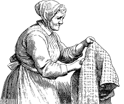 My understanding is that, as a rule, the work on such occasions consisted of the quilting proper, as the name would imply. That was surely tedious enough and made enormous demands on industry and perseverance, levying a heavy toll on time, carefulness and skill. An examination of any one of those early quilts will show how close together the seams commonly were, how regularly those distances were maintained and how dainty and precise the stitches. Quilting is now done sometimes by religious or benevolent societies of women for pay, the price depending on the thread used, two spools being the minimum, four hundred yards of thread to a quilt. But in many of these old quilts twelve or more spools were used. Think of what was involved in thus running almost three thousand yards of fine thread in such deliberate, perfect fashion. Not to mention the opportunity for talking and visiting it could afford.
